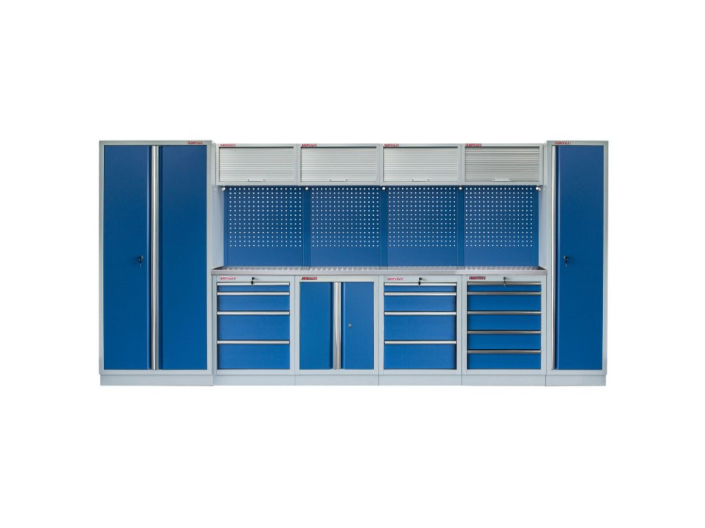 Dílenský nábytek PROFI BLUE s nerezovou deskou zaujme moderním a profesionálním vzhledem. Kombinace modré RAL 5023 a šedé RAL 7035 barvy se bude vyjímat v každé garáži i dílně. Sestava nábytku v sobě skrývá dostatečné množství úložného prostoru pro vaše nářadí, autotechniku i dílenské vybavení. V kombinaci s bytelnou pracovní deskou získáte multifunkční stěnu, se kterou vám půjde práce od ruky ve všech směrech. Jednotlivé komponenty jsou plně konfigurovatelné, sestavu je možné dle vašich potřeb rozšířit o další skříně, regály i ponk.Sestava nábytku MTGS1300A66