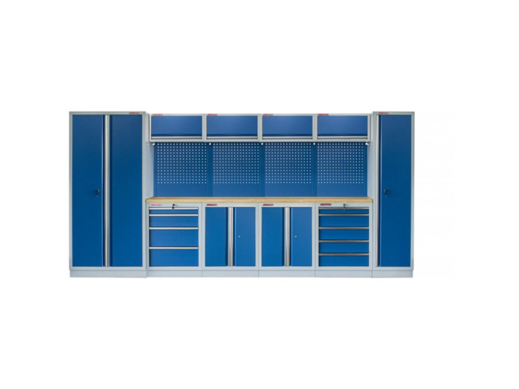 Dílenský nábytek PROFI BLUE s dřevěnou deskou zaujme moderním a profesionálním vzhledem. Kombinace modré RAL 5023 a šedé RAL 7035 barvy se bude vyjímat v každé garáži i dílně. Sestava nábytku v sobě skrývá dostatečné množství úložného prostoru pro vaše nářadí, autotechniku i dílenské vybavení. V kombinaci s bytelnou pracovní deskou získáte multifunkční stěnu, se kterou vám půjde práce od ruky ve všech směrech. Jednotlivé komponenty jsou plně konfigurovatelné, sestavu je možné dle vašich potřeb rozšířit o další skříně, regály i ponk.Sestava nábytku MTGS1300AA6