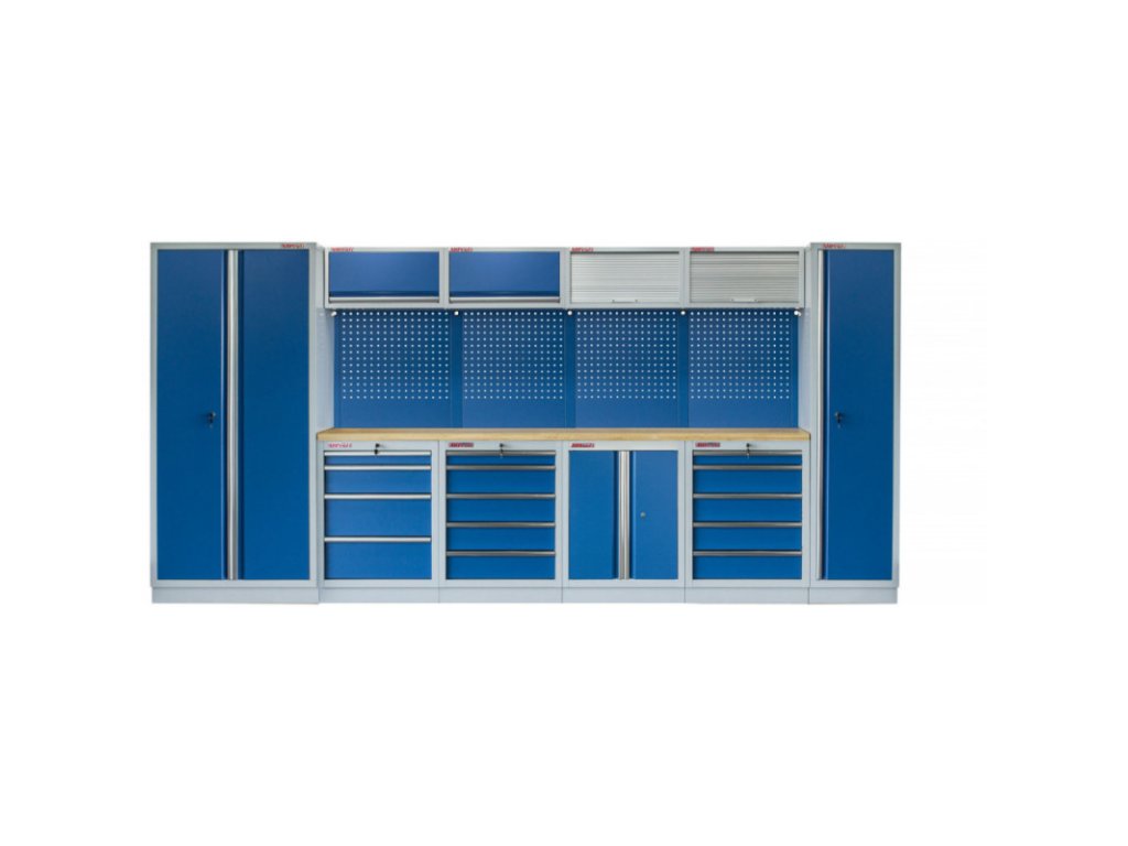 Dílenský nábytek PROFI BLUE s dřevěnou deskou zaujme moderním a profesionálním vzhledem. Kombinace modré RAL 5023 a šedé RAL 7035 barvy se bude vyjímat v každé garáži i dílně. Sestava nábytku v sobě skrývá dostatečné množství úložného prostoru pro vaše nářadí, autotechniku i dílenské vybavení. V kombinaci s bytelnou pracovní deskou získáte multifunkční stěnu, se kterou vám půjde práce od ruky ve všech směrech. Jednotlivé komponenty jsou plně konfigurovatelné, sestavu je možné dle vašich potřeb rozšířit o další skříně, regály i ponk.Sestava nábytku MTGS1300AB