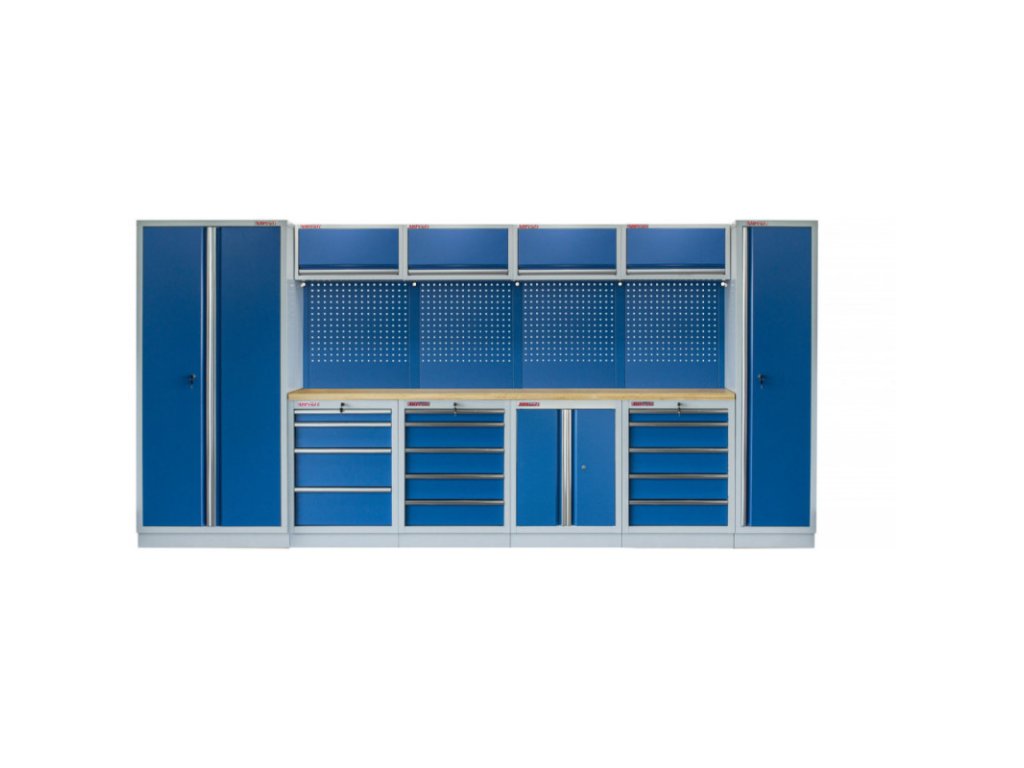 Dílenský nábytek PROFI BLUE s dřevěnou deskou zaujme moderním a profesionálním vzhledem. Kombinace modré RAL 5023 a šedé RAL 7035 barvy se bude vyjímat v každé garáži i dílně. Sestava nábytku v sobě skrývá dostatečné množství úložného prostoru pro vaše nářadí, autotechniku i dílenské vybavení. V kombinaci s bytelnou pracovní deskou získáte multifunkční stěnu, se kterou vám půjde práce od ruky ve všech směrech. Jednotlivé komponenty jsou plně konfigurovatelné, sestavu je možné dle vašich potřeb rozšířit o další skříně, regály i ponk.Sestava nábytku MTGS1300AD