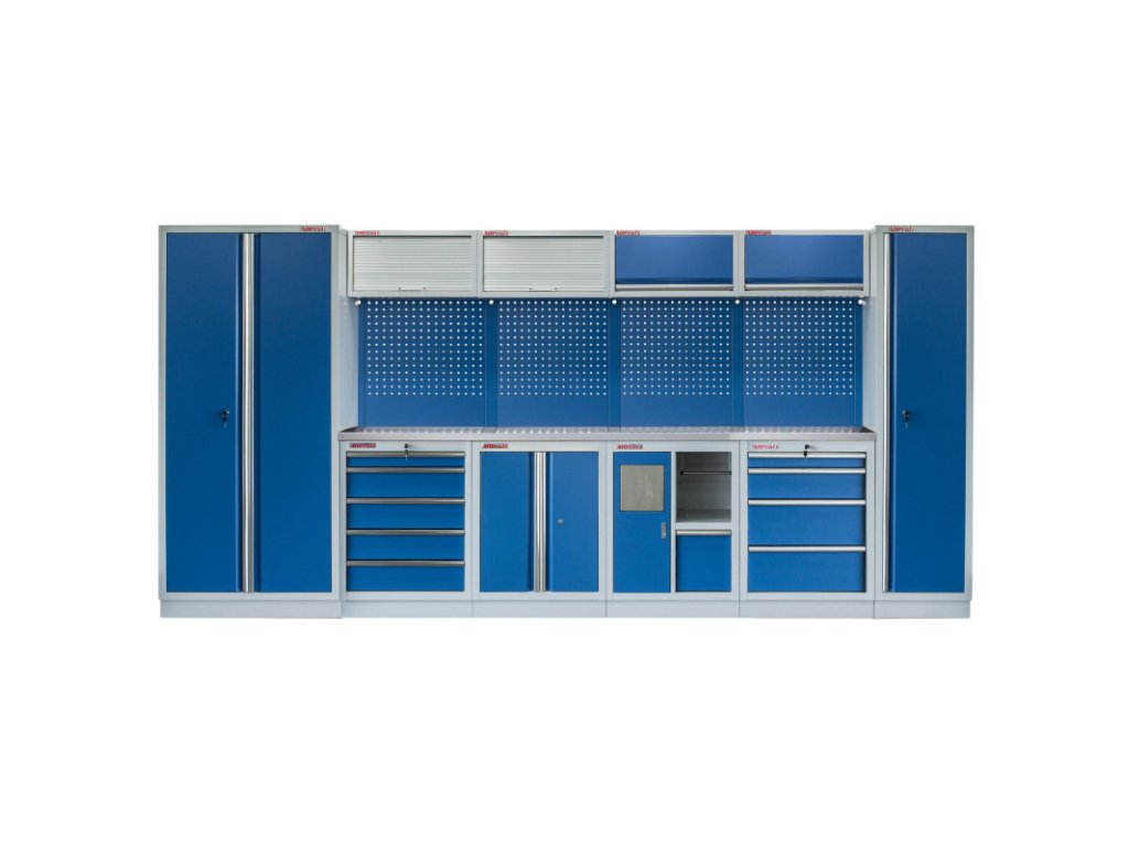 Dílenský nábytek PROFI BLUE s nerezovou deskou zaujme moderním a profesionálním vzhledem. Kombinace modré RAL 5023 a šedé RAL 7035 barvy se bude vyjímat v každé garáži i dílně. Sestava nábytku v sobě skrývá dostatečné množství úložného prostoru pro vaše nářadí, autotechniku i dílenské vybavení. V kombinaci s bytelnou pracovní deskou získáte multifunkční stěnu, se kterou vám půjde práce od ruky ve všech směrech. Jednotlivé komponenty jsou plně konfigurovatelné, sestavu je možné dle vašich potřeb rozšířit o další skříně, regály i ponk.Sestava nábytku MTGS1301AF