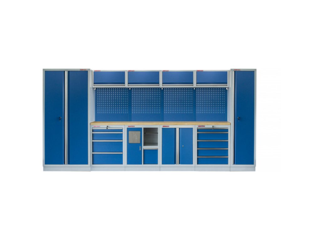 Dílenský nábytek PROFI BLUE s dřevěnou deskou zaujme moderním a profesionálním vzhledem. Kombinace modré RAL 5023 a šedé RAL 7035 barvy se bude vyjímat v každé garáži i dílně. Sestava nábytku v sobě skrývá dostatečné množství úložného prostoru pro vaše nářadí, autotechniku i dílenské vybavení. V kombinaci s bytelnou pracovní deskou získáte multifunkční stěnu, se kterou vám půjde práce od ruky ve všech směrech. Jednotlivé komponenty jsou plně konfigurovatelné, sestavu je možné dle vašich potřeb rozšířit o další skříně, regály i ponk.Sestava nábytku MTGS1301AI