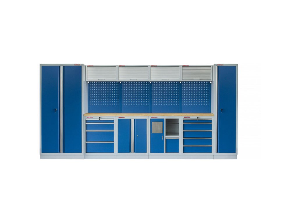 Dílenský nábytek PROFI BLUE s dřevěnou deskou zaujme moderním a profesionálním vzhledem. Kombinace modré RAL 5023 a šedé RAL 7035 barvy se bude vyjímat v každé garáži i dílně. Sestava nábytku v sobě skrývá dostatečné množství úložného prostoru pro vaše nářadí, autotechniku i dílenské vybavení. V kombinaci s bytelnou pracovní deskou získáte multifunkční stěnu, se kterou vám půjde práce od ruky ve všech směrech. Jednotlivé komponenty jsou plně konfigurovatelné, sestavu je možné dle vašich potřeb rozšířit o další skříně, regály i ponk.Sestava nábytku MTGS1301AJ