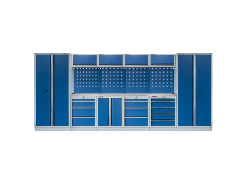 Dílenský nábytek PROFI BLUE s nerezovou deskou zaujme moderním a profesionálním vzhledem. Kombinace modré RAL 5023 a šedé RAL 7035 barvy se bude vyjímat v každé garáži i dílně. Sestava nábytku v sobě skrývá dostatečné množství úložného prostoru pro vaše nářadí, autotechniku i dílenské vybavení. V kombinaci s bytelnou pracovní deskou získáte multifunkční stěnu, se kterou vám půjde práce od ruky ve všech směrech. Jednotlivé komponenty jsou plně konfigurovatelné, sestavu je možné dle vašich potřeb rozšířit o další skříně, regály i ponk.Sestava nábytku MTGS1300A22