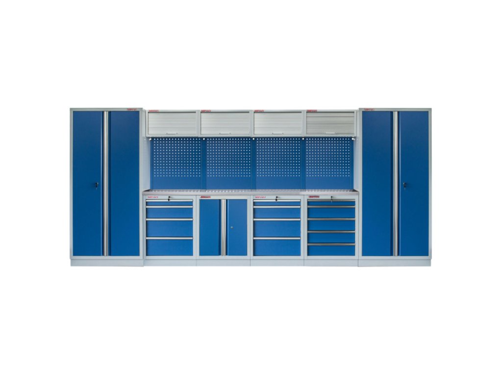 Dílenský nábytek PROFI BLUE s nerezovou deskou zaujme moderním a profesionálním vzhledem. Kombinace modré RAL 5023 a šedé RAL 7035 barvy se bude vyjímat v každé garáži i dílně. Sestava nábytku v sobě skrývá dostatečné množství úložného prostoru pro vaše nářadí, autotechniku i dílenské vybavení. V kombinaci s bytelnou pracovní deskou získáte multifunkční stěnu, se kterou vám půjde práce od ruky ve všech směrech. Jednotlivé komponenty jsou plně konfigurovatelné, sestavu je možné dle vašich potřeb rozšířit o další skříně, regály i ponk.Sestava nábytku MTGS1300A33