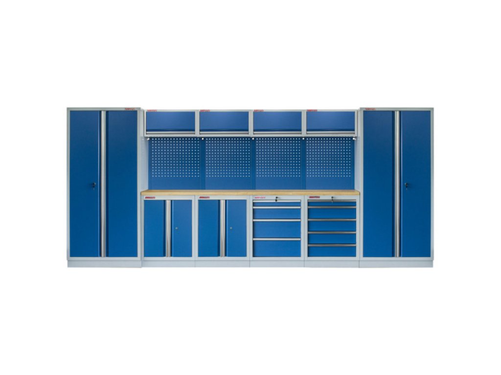 Dílenský nábytek PROFI BLUE s dřevěnou deskou zaujme moderním a profesionálním vzhledem. Kombinace modré RAL 5023 a šedé RAL 7035 barvy se bude vyjímat v každé garáži i dílně. Sestava nábytku v sobě skrývá dostatečné množství úložného prostoru pro vaše nářadí, autotechniku i dílenské vybavení. V kombinaci s bytelnou pracovní deskou získáte multifunkční stěnu, se kterou vám půjde práce od ruky ve všech směrech. Jednotlivé komponenty jsou plně konfigurovatelné, sestavu je možné dle vašich potřeb rozšířit o další skříně, regály i ponk.Sestava nábytku MTGS1300AA2
