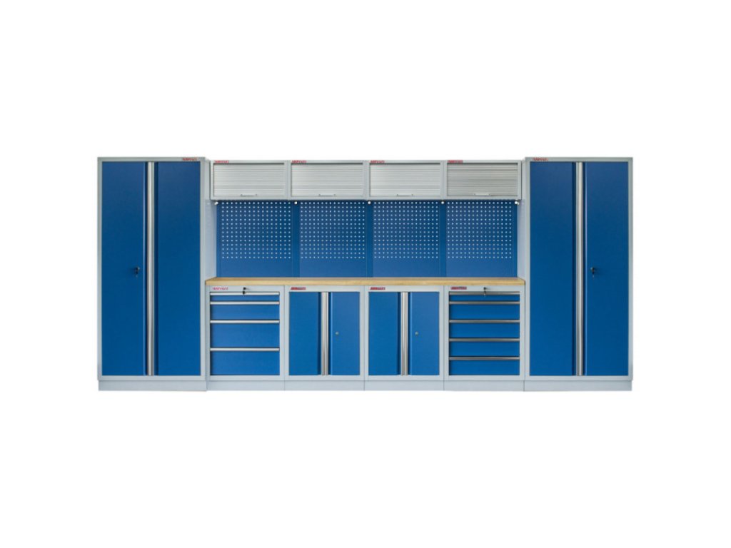 Dílenský nábytek PROFI BLUE s dřevěnou deskou zaujme moderním a profesionálním vzhledem. Kombinace modré RAL 5023 a šedé RAL 7035 barvy se bude vyjímat v každé garáži i dílně. Sestava nábytku v sobě skrývá dostatečné množství úložného prostoru pro vaše nářadí, autotechniku i dílenské vybavení. V kombinaci s bytelnou pracovní deskou získáte multifunkční stěnu, se kterou vám půjde práce od ruky ve všech směrech. Jednotlivé komponenty jsou plně konfigurovatelné, sestavu je možné dle vašich potřeb rozšířit o další skříně, regály i ponk.Sestava nábytku MTGS1300AA3