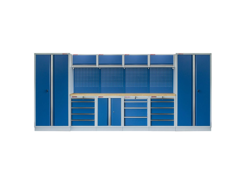 Dílenský nábytek PROFI BLUE s dřevěnou deskou zaujme moderním a profesionálním vzhledem. Kombinace modré RAL 5023 a šedé RAL 7035 barvy se bude vyjímat v každé garáži i dílně. Sestava nábytku v sobě skrývá dostatečné množství úložného prostoru pro vaše nářadí, autotechniku i dílenské vybavení. V kombinaci s bytelnou pracovní deskou získáte multifunkční stěnu, se kterou vám půjde práce od ruky ve všech směrech. Jednotlivé komponenty jsou plně konfigurovatelné, sestavu je možné dle vašich potřeb rozšířit o další skříně, regály i ponk.Sestava nábytku MTGS1300AE