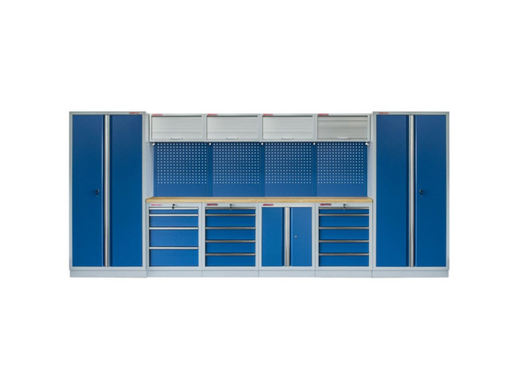 Dílenský nábytek PROFI BLUE s dřevěnou deskou zaujme moderním a profesionálním vzhledem. Kombinace modré RAL 5023 a šedé RAL 7035 barvy se bude vyjímat v každé garáži i dílně. Sestava nábytku v sobě skrývá dostatečné množství úložného prostoru pro vaše nářadí, autotechniku i dílenské vybavení. V kombinaci s bytelnou pracovní deskou získáte multifunkční stěnu, se kterou vám půjde práce od ruky ve všech směrech. Jednotlivé komponenty jsou plně konfigurovatelné, sestavu je možné dle vašich potřeb rozšířit o další skříně, regály i ponk.Sestava nábytku MTGS1300AI