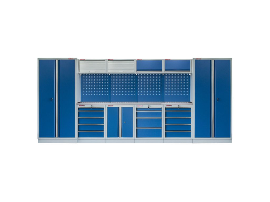Dílenský nábytek PROFI BLUE s nerezovou deskou zaujme moderním a profesionálním vzhledem. Kombinace modré RAL 5023 a šedé RAL 7035 barvy se bude vyjímat v každé garáži i dílně. Sestava nábytku v sobě skrývá dostatečné množství úložného prostoru pro vaše nářadí, autotechniku i dílenské vybavení. V kombinaci s bytelnou pracovní deskou získáte multifunkční stěnu, se kterou vám půjde práce od ruky ve všech směrech. Jednotlivé komponenty jsou plně konfigurovatelné, sestavu je možné dle vašich potřeb rozšířit o další skříně, regály i ponk.Sestava nábytku MTGS1300AM