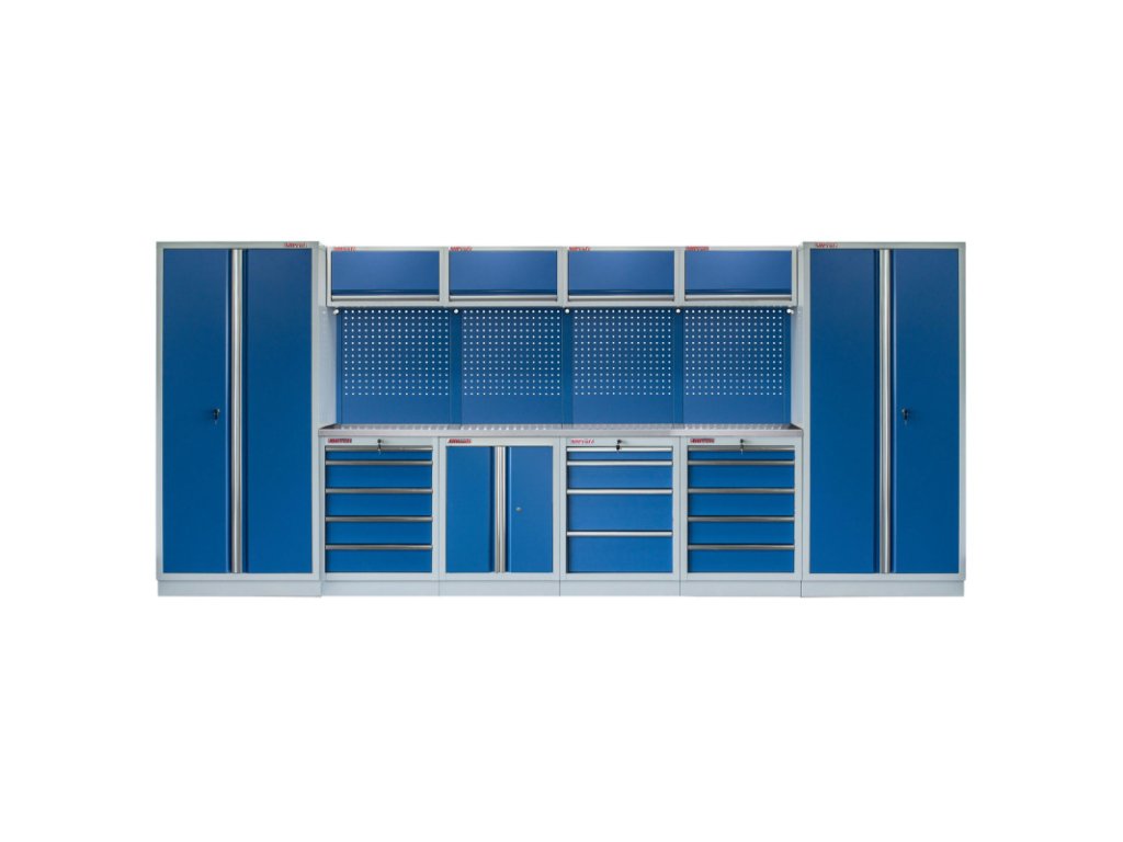 Dílenský nábytek PROFI BLUE s nerezovou deskou zaujme moderním a profesionálním vzhledem. Kombinace modré RAL 5023 a šedé RAL 7035 barvy se bude vyjímat v každé garáži i dílně. Sestava nábytku v sobě skrývá dostatečné množství úložného prostoru pro vaše nářadí, autotechniku i dílenské vybavení. V kombinaci s bytelnou pracovní deskou získáte multifunkční stěnu, se kterou vám půjde práce od ruky ve všech směrech. Jednotlivé komponenty jsou plně konfigurovatelné, sestavu je možné dle vašich potřeb rozšířit o další skříně, regály i ponk.Sestava nábytku MTGS1300AP