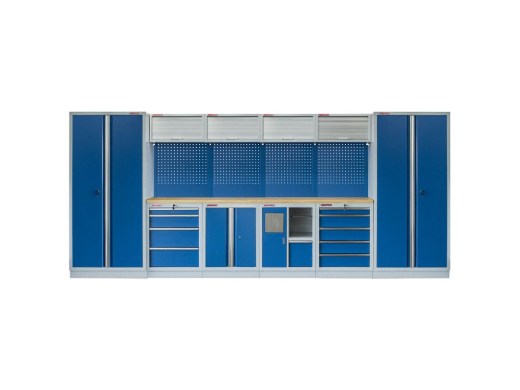 Dílenský nábytek PROFI BLUE s dřevěnou deskou zaujme moderním a profesionálním vzhledem. Kombinace modré RAL 5023 a šedé RAL 7035 barvy se bude vyjímat v každé garáži i dílně. Sestava nábytku v sobě skrývá dostatečné množství úložného prostoru pro vaše nářadí, autotechniku i dílenské vybavení. V kombinaci s bytelnou pracovní deskou získáte multifunkční stěnu, se kterou vám půjde práce od ruky ve všech směrech. Jednotlivé komponenty jsou plně konfigurovatelné, sestavu je možné dle vašich potřeb rozšířit o další skříně, regály i ponk.Sestava nábytku MTGS1301AH