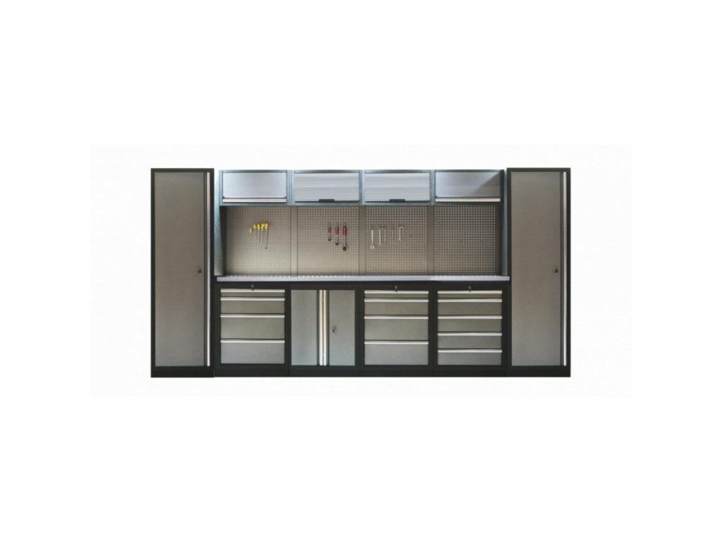 Dílenský nábytek PROFI GREY s nerezovou deskou zaujme moderním a profesionálním vzhledem. Kombinace kladívkové šedé a černé RAL 9004 barvy se bude vyjímat v každé garáži i dílně. Sestava nábytku v sobě skrývá dostatečné množství úložného prostoru pro vaše nářadí, autotechniku i dílenské vybavení. V kombinaci s bytelnou pracovní deskou získáte multifunkční stěnu, se kterou vám půjde práce od ruky ve všech směrech. Jednotlivé komponenty jsou plně konfigurovatelné, sestavu je možné dle vašich potřeb rozšířit o další skříně, regály i ponk.Sestava nábytku TGS1300A77