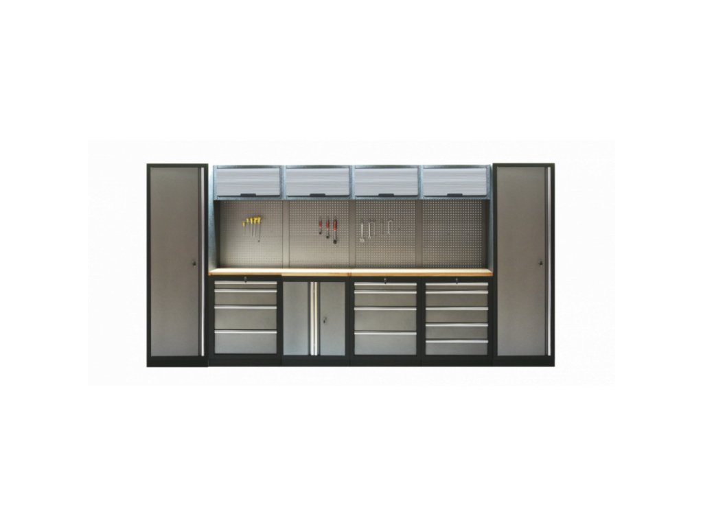 Dílenský nábytek PROFI GREY s dřevěnou deskou zaujme moderním a profesionálním vzhledem. Kombinace kladívkové šedé a černé RAL 9004 se bude vyjímat v každé garáži i dílně. Sestava nábytku v sobě skrývá dostatečné množství úložného prostoru pro vaše nářadí, autotechniku i dílenské vybavení. V kombinaci s bytelnou pracovní deskou získáte multifunkční stěnu, se kterou vám půjde práce od ruky ve všech směrech. Jednotlivé komponenty jsou plně konfigurovatelné, sestavu je možné dle vašich potřeb rozšířit o další skříně, regály i ponk.Sestava nábytku TGS1300A9