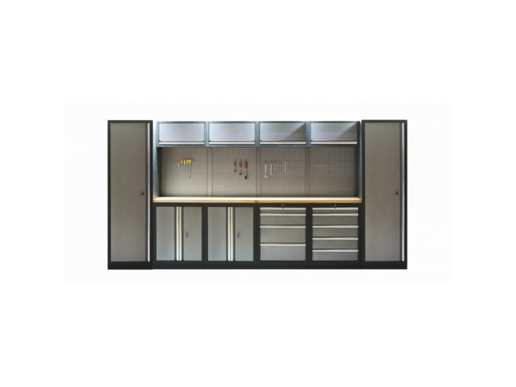 Dílenský nábytek PROFI GREY s dřevěnou deskou zaujme moderním a profesionálním vzhledem. Kombinace kladívkové šedé a černé RAL 9004 se bude vyjímat v každé garáži i dílně. Sestava nábytku v sobě skrývá dostatečné množství úložného prostoru pro vaše nářadí, autotechniku i dílenské vybavení. V kombinaci s bytelnou pracovní deskou získáte multifunkční stěnu, se kterou vám půjde práce od ruky ve všech směrech. Jednotlivé komponenty jsou plně konfigurovatelné, sestavu je možné dle vašich potřeb rozšířit o další skříně, regály i ponk.Sestava nábytku TGS1300AA4