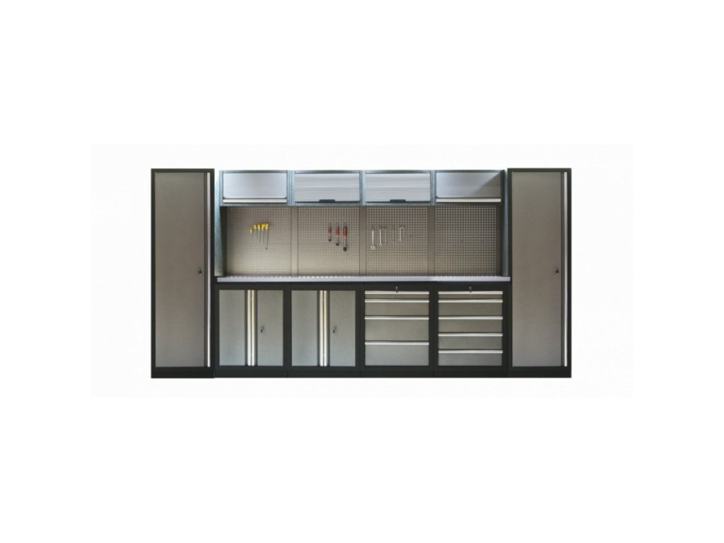 Dílenský nábytek PROFI GREY s nerezovou deskou zaujme moderním a profesionálním vzhledem. Kombinace kladívkové šedé a černé RAL 9004 barvy se bude vyjímat v každé garáži i dílně. Sestava nábytku v sobě skrývá dostatečné množství úložného prostoru pro vaše nářadí, autotechniku i dílenské vybavení. V kombinaci s bytelnou pracovní deskou získáte multifunkční stěnu, se kterou vám půjde práce od ruky ve všech směrech. Jednotlivé komponenty jsou plně konfigurovatelné, sestavu je možné dle vašich potřeb rozšířit o další skříně, regály i ponk.Sestava nábytku TGS1300BB7