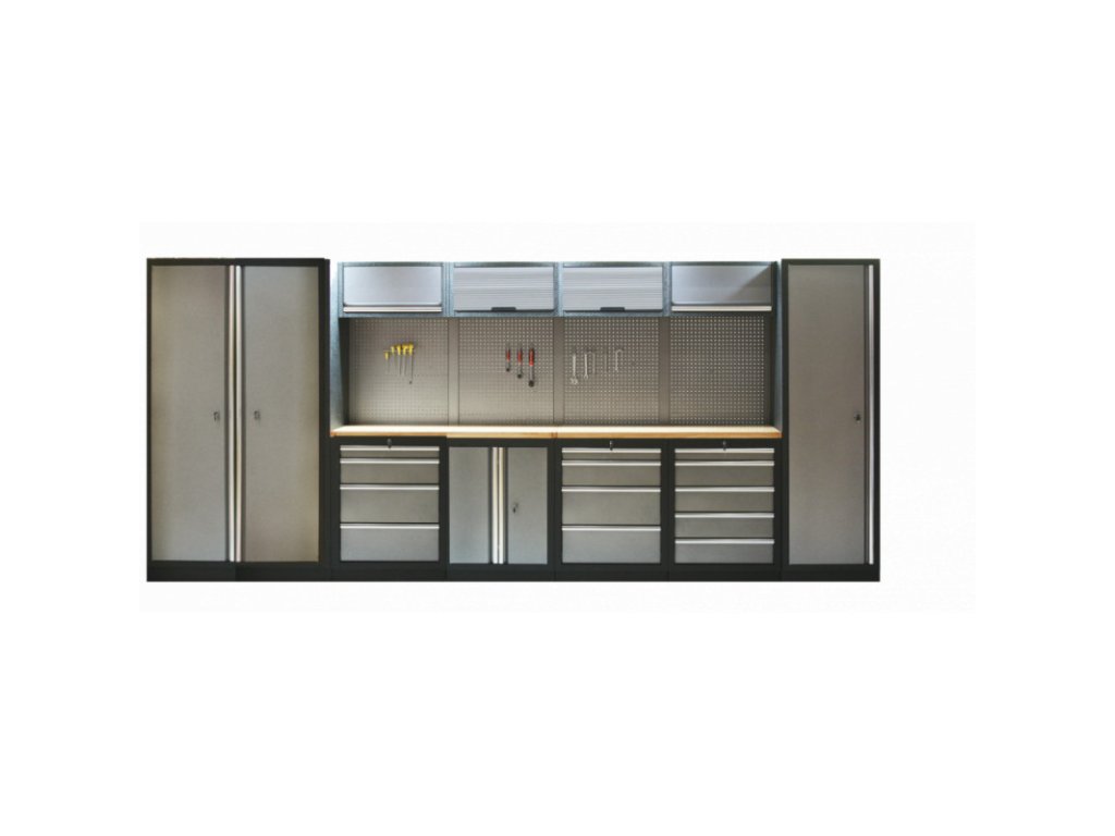 Dílenský nábytek PROFI GREY s dřevěnou deskou zaujme moderním a profesionálním vzhledem. Kombinace kladívkové šedé a černé RAL 9004 se bude vyjímat v každé garáži i dílně. Sestava nábytku v sobě skrývá dostatečné množství úložného prostoru pro vaše nářadí, autotechniku i dílenské vybavení. V kombinaci s bytelnou pracovní deskou získáte multifunkční stěnu, se kterou vám půjde práce od ruky ve všech směrech. Jednotlivé komponenty jsou plně konfigurovatelné, sestavu je možné dle vašich potřeb rozšířit o další skříně, regály i ponk.Sestava nábytku TGS1300A4