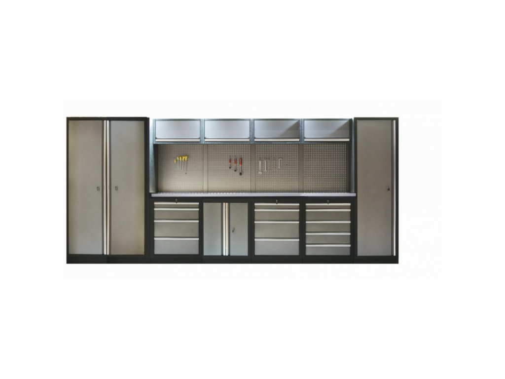 Dílenský nábytek PROFI GREY s nerezovou deskou zaujme moderním a profesionálním vzhledem. Kombinace kladívkové šedé a černé RAL 9004 barvy se bude vyjímat v každé garáži i dílně. Sestava nábytku v sobě skrývá dostatečné množství úložného prostoru pro vaše nářadí, autotechniku i dílenské vybavení. V kombinaci s bytelnou pracovní deskou získáte multifunkční stěnu, se kterou vám půjde práce od ruky ve všech směrech. Jednotlivé komponenty jsou plně konfigurovatelné, sestavu je možné dle vašich potřeb rozšířit o další skříně, regály i ponk.Sestava nábytku TGS1300A55