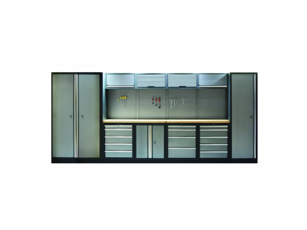 Dílenský nábytek PROFI GREY s dřevěnou deskou zaujme moderním a profesionálním vzhledem. Kombinace kladívkové šedé a černé RAL 9004 se bude vyjímat v každé garáži i dílně. Sestava nábytku v sobě skrývá dostatečné množství úložného prostoru pro vaše nářadí, autotechniku i dílenské vybavení. V kombinaci s bytelnou pracovní deskou získáte multifunkční stěnu, se kterou vám půjde práce od ruky ve všech směrech. Jednotlivé komponenty jsou plně konfigurovatelné, sestavu je možné dle vašich potřeb rozšířit o další skříně, regály i ponk.Sestava nábytku TGS1300AB