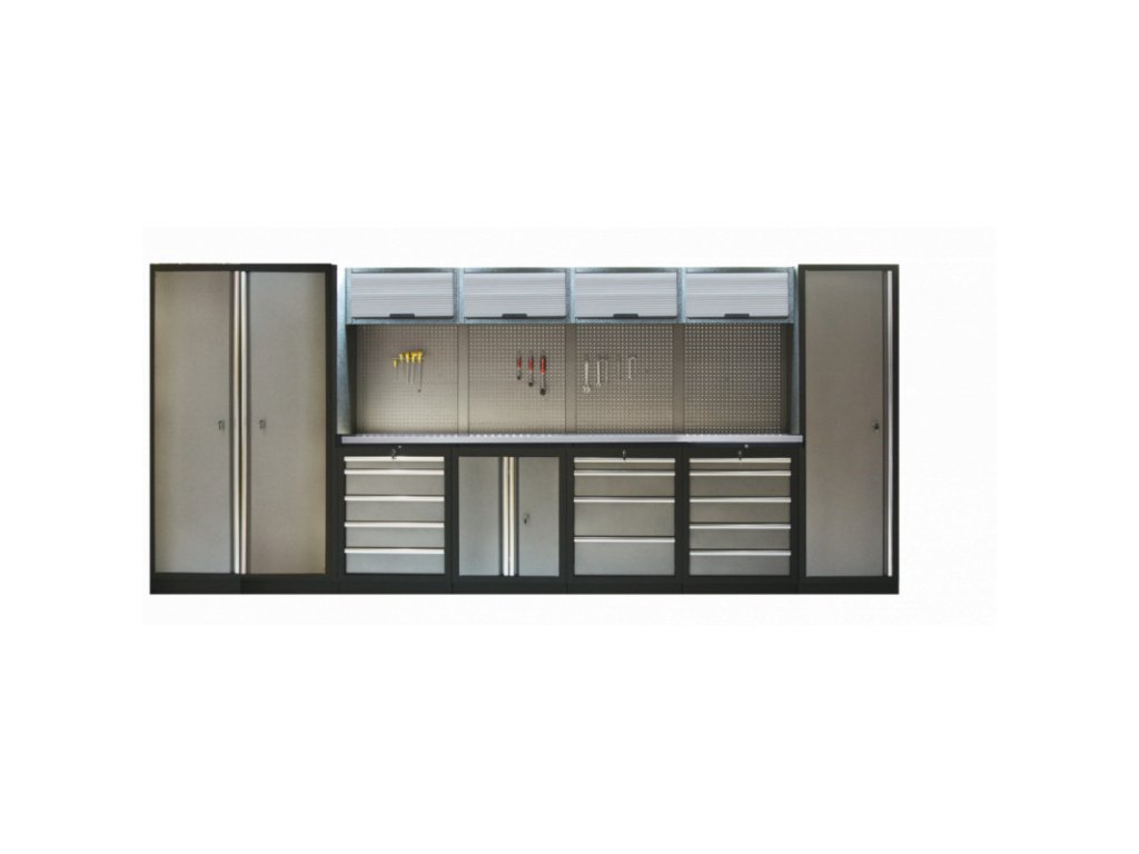 Dílenský nábytek PROFI GREY s nerezovou deskou zaujme moderním a profesionálním vzhledem. Kombinace kladívkové šedé a černé RAL 9004 barvy se bude vyjímat v každé garáži i dílně. Sestava nábytku v sobě skrývá dostatečné množství úložného prostoru pro vaše nářadí, autotechniku i dílenské vybavení. V kombinaci s bytelnou pracovní deskou získáte multifunkční stěnu, se kterou vám půjde práce od ruky ve všech směrech. Jednotlivé komponenty jsou plně konfigurovatelné, sestavu je možné dle vašich potřeb rozšířit o další skříně, regály i ponk.Sestava nábytku TGS1300AQ