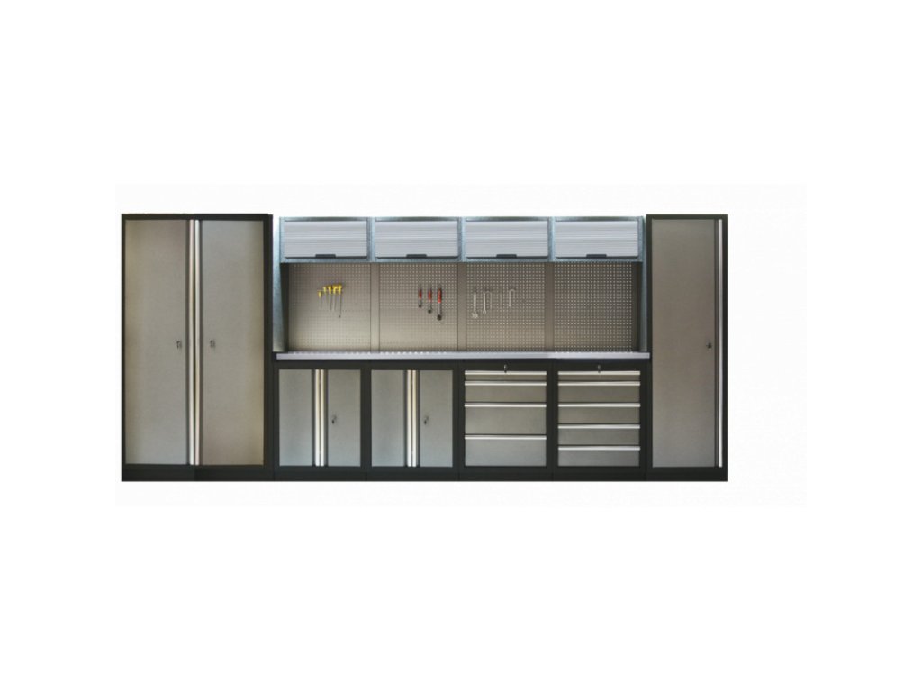 Dílenský nábytek PROFI GREY s nerezovou deskou zaujme moderním a profesionálním vzhledem. Kombinace kladívkové šedé a černé RAL 9004 barvy se bude vyjímat v každé garáži i dílně. Sestava nábytku v sobě skrývá dostatečné množství úložného prostoru pro vaše nářadí, autotechniku i dílenské vybavení. V kombinaci s bytelnou pracovní deskou získáte multifunkční stěnu, se kterou vám půjde práce od ruky ve všech směrech. Jednotlivé komponenty jsou plně konfigurovatelné, sestavu je možné dle vašich potřeb rozšířit o další skříně, regály i ponk.Sestava nábytku TGS1300BB6