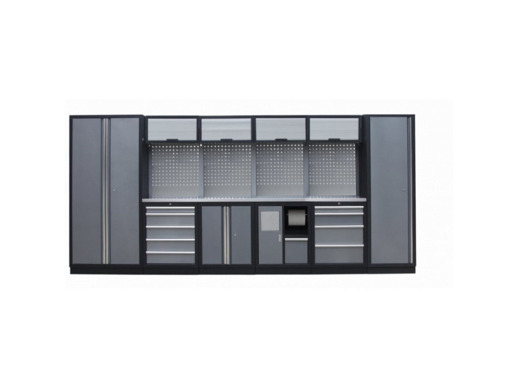 Dílenský nábytek PROFI GREY s nerezovou deskou zaujme moderním a profesionálním vzhledem. Kombinace kladívkové šedé a černé RAL 9004 barvy se bude vyjímat v každé garáži i dílně. Sestava nábytku v sobě skrývá dostatečné množství úložného prostoru pro vaše nářadí, autotechniku i dílenské vybavení. V kombinaci s bytelnou pracovní deskou získáte multifunkční stěnu, se kterou vám půjde práce od ruky ve všech směrech. Jednotlivé komponenty jsou plně konfigurovatelné, sestavu je možné dle vašich potřeb rozšířit o další skříně, regály i ponk.Sestava nábytku TGS1301AL