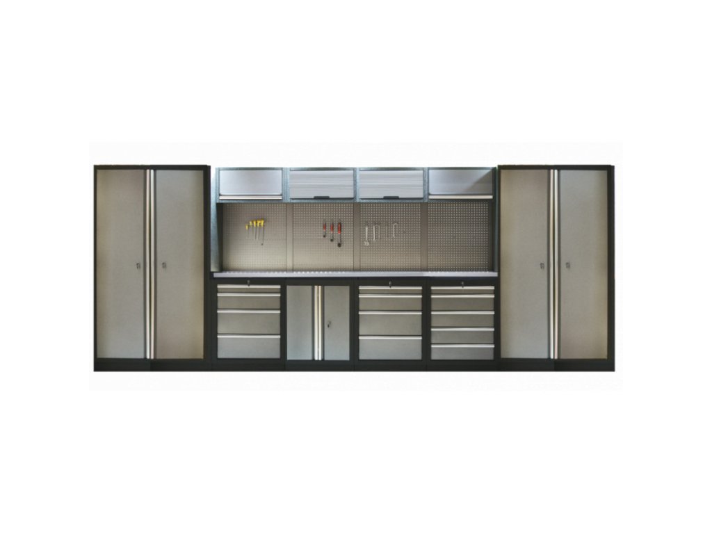 Dílenský nábytek PROFI GREY s nerezovou deskou zaujme moderním a profesionálním vzhledem. Kombinace kladívkové šedé a černé RAL 9004 barvy se bude vyjímat v každé garáži i dílně. Sestava nábytku v sobě skrývá dostatečné množství úložného prostoru pro vaše nářadí, autotechniku i dílenské vybavení. V kombinaci s bytelnou pracovní deskou získáte multifunkční stěnu, se kterou vám půjde práce od ruky ve všech směrech. Jednotlivé komponenty jsou plně konfigurovatelné, sestavu je možné dle vašich potřeb rozšířit o další skříně, regály i ponk.Sestava nábytku TGS1300A11