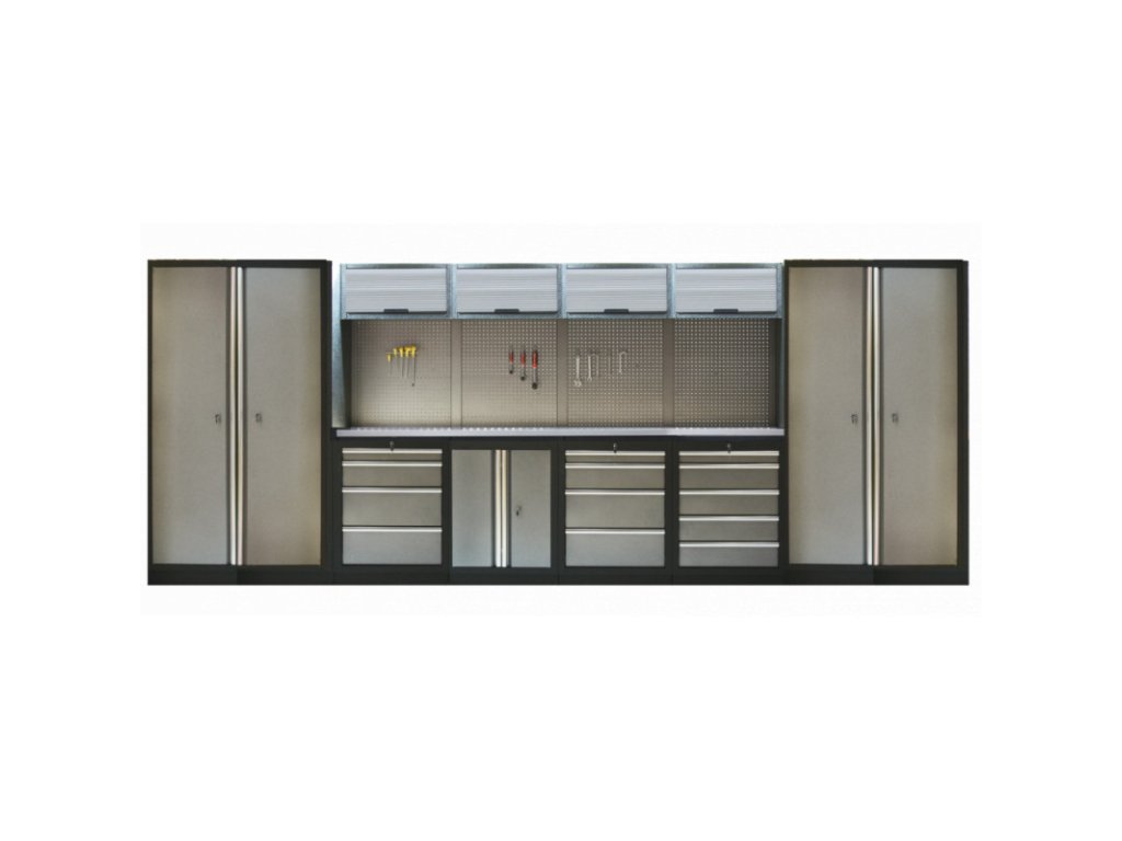 Dílenský nábytek PROFI GREY s nerezovou deskou zaujme moderním a profesionálním vzhledem. Kombinace kladívkové šedé a černé RAL 9004 barvy se bude vyjímat v každé garáži i dílně. Sestava nábytku v sobě skrývá dostatečné množství úložného prostoru pro vaše nářadí, autotechniku i dílenské vybavení. V kombinaci s bytelnou pracovní deskou získáte multifunkční stěnu, se kterou vám půjde práce od ruky ve všech směrech. Jednotlivé komponenty jsou plně konfigurovatelné, sestavu je možné dle vašich potřeb rozšířit o další skříně, regály i ponk.Sestava nábytku TGS1300A33