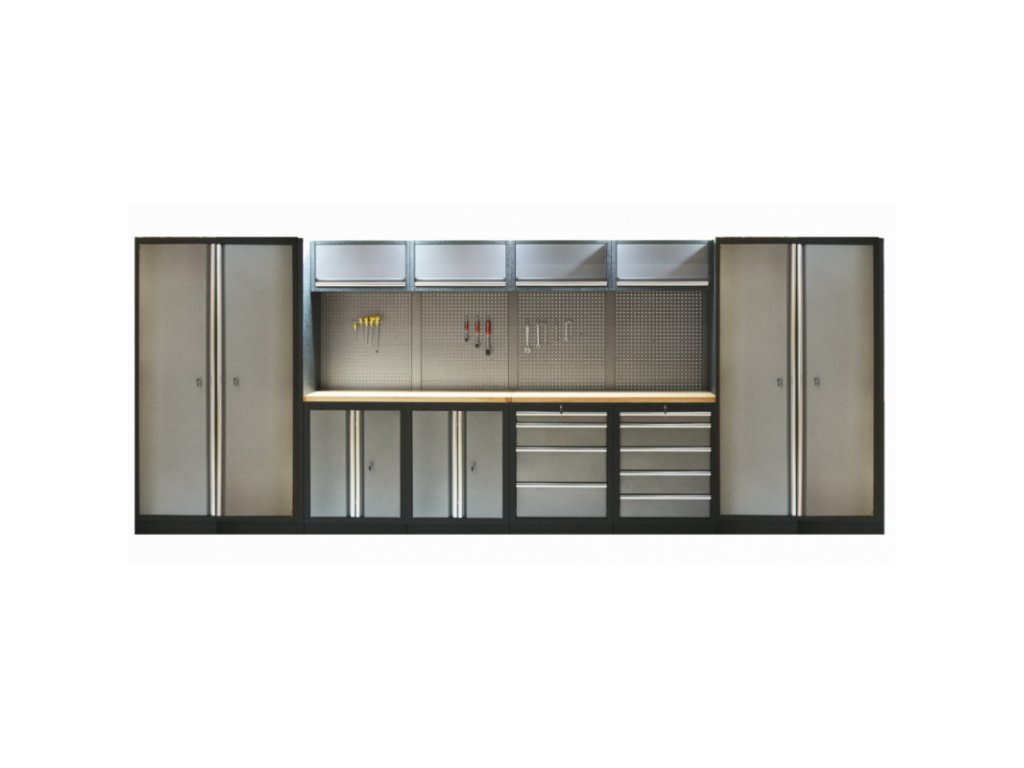 Dílenský nábytek PROFI GREY s dřevěnou deskou zaujme moderním a profesionálním vzhledem. Kombinace kladívkové šedé a černé RAL 9004 se bude vyjímat v každé garáži i dílně. Sestava nábytku v sobě skrývá dostatečné množství úložného prostoru pro vaše nářadí, autotechniku i dílenské vybavení. V kombinaci s bytelnou pracovní deskou získáte multifunkční stěnu, se kterou vám půjde práce od ruky ve všech směrech. Jednotlivé komponenty jsou plně konfigurovatelné, sestavu je možné dle vašich potřeb rozšířit o další skříně, regály i ponk.Sestava nábytku TGS1300AA2