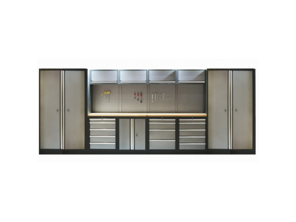 Dílenský nábytek PROFI GREY s dřevěnou deskou zaujme moderním a profesionálním vzhledem. Kombinace kladívkové šedé a černé RAL 9004 se bude vyjímat v každé garáži i dílně. Sestava nábytku v sobě skrývá dostatečné množství úložného prostoru pro vaše nářadí, autotechniku i dílenské vybavení. V kombinaci s bytelnou pracovní deskou získáte multifunkční stěnu, se kterou vám půjde práce od ruky ve všech směrech. Jednotlivé komponenty jsou plně konfigurovatelné, sestavu je možné dle vašich potřeb rozšířit o další skříně, regály i ponk.Sestava nábytku TGS1300AE