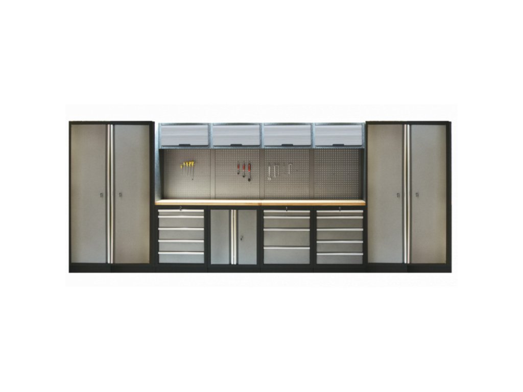 Dílenský nábytek PROFI GREY s dřevěnou deskou zaujme moderním a profesionálním vzhledem. Kombinace kladívkové šedé a černé RAL 9004 se bude vyjímat v každé garáži i dílně. Sestava nábytku v sobě skrývá dostatečné množství úložného prostoru pro vaše nářadí, autotechniku i dílenské vybavení. V kombinaci s bytelnou pracovní deskou získáte multifunkční stěnu, se kterou vám půjde práce od ruky ve všech směrech. Jednotlivé komponenty jsou plně konfigurovatelné, sestavu je možné dle vašich potřeb rozšířit o další skříně, regály i ponk.Sestava nábytku TGS1300AI