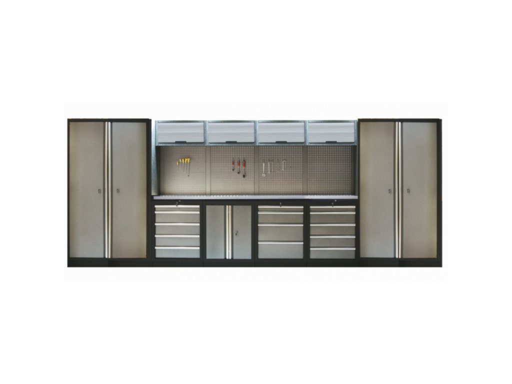 Dílenský nábytek PROFI GREY s nerezovou deskou zaujme moderním a profesionálním vzhledem. Kombinace kladívkové šedé a černé RAL 9004 barvy se bude vyjímat v každé garáži i dílně. Sestava nábytku v sobě skrývá dostatečné množství úložného prostoru pro vaše nářadí, autotechniku i dílenské vybavení. V kombinaci s bytelnou pracovní deskou získáte multifunkční stěnu, se kterou vám půjde práce od ruky ve všech směrech. Jednotlivé komponenty jsou plně konfigurovatelné, sestavu je možné dle vašich potřeb rozšířit o další skříně, regály i ponk.Sestava nábytku TGS1300AO