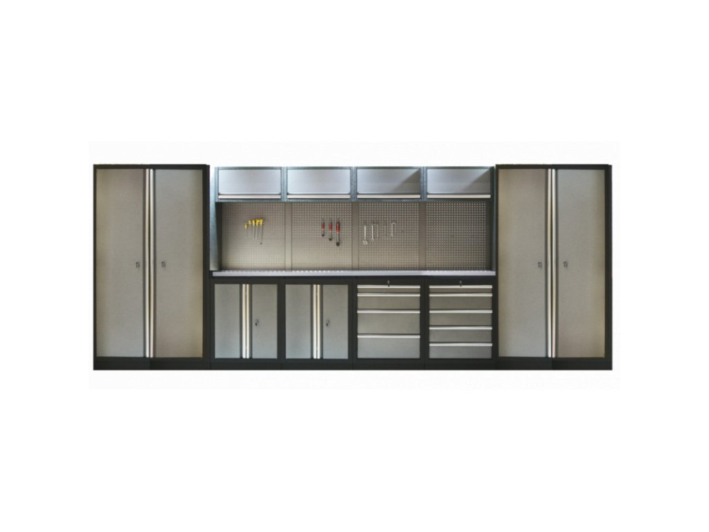 Dílenský nábytek PROFI GREY s nerezovou deskou zaujme moderním a profesionálním vzhledem. Kombinace kladívkové šedé a černé RAL 9004 barvy se bude vyjímat v každé garáži i dílně. Sestava nábytku v sobě skrývá dostatečné množství úložného prostoru pro vaše nářadí, autotechniku i dílenské vybavení. V kombinaci s bytelnou pracovní deskou získáte multifunkční stěnu, se kterou vám půjde práce od ruky ve všech směrech. Jednotlivé komponenty jsou plně konfigurovatelné, sestavu je možné dle vašich potřeb rozšířit o další skříně, regály i ponk.Sestava nábytku TGS1300BB2