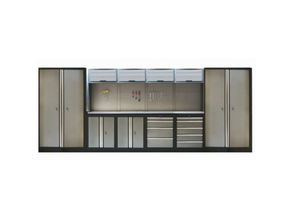 Dílenský nábytek PROFI GREY s nerezovou deskou zaujme moderním a profesionálním vzhledem. Kombinace kladívkové šedé a černé RAL 9004 barvy se bude vyjímat v každé garáži i dílně. Sestava nábytku v sobě skrývá dostatečné množství úložného prostoru pro vaše nářadí, autotechniku i dílenské vybavení. V kombinaci s bytelnou pracovní deskou získáte multifunkční stěnu, se kterou vám půjde práce od ruky ve všech směrech. Jednotlivé komponenty jsou plně konfigurovatelné, sestavu je možné dle vašich potřeb rozšířit o další skříně, regály i ponk.Sestava nábytku TGS1300BB3