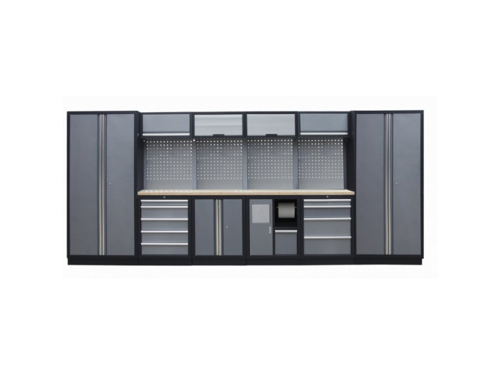 Dílenský nábytek PROFI GREY s dřevěnou deskou zaujme moderním a profesionálním vzhledem. Kombinace kladívkové šedé a černé RAL 9004 se bude vyjímat v každé garáži i dílně. Sestava nábytku v sobě skrývá dostatečné množství úložného prostoru pro vaše nářadí, autotechniku i dílenské vybavení. V kombinaci s bytelnou pracovní deskou získáte multifunkční stěnu, se kterou vám půjde práce od ruky ve všech směrech. Jednotlivé komponenty jsou plně konfigurovatelné, sestavu je možné dle vašich potřeb rozšířit o další skříně, regály i ponk.Sestava nábytku TGS1301AD