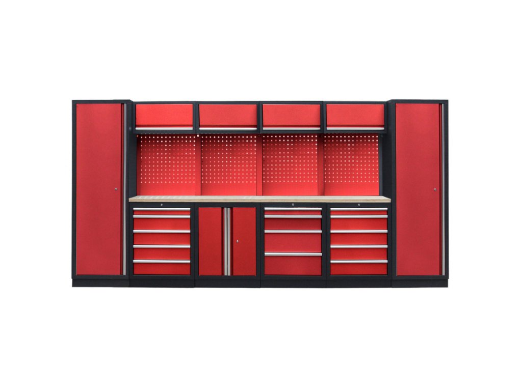 Dílenský nábytek PROFI RED s dřevěnou deskou zaujme moderním a profesionálním vzhledem. Kombinace červené RAL 3031 a černé RAL 9004 se bude vyjímat v každé garáži i dílně. Sestava nábytku v sobě skrývá dostatečné množství úložného prostoru pro vaše nářadí, autotechniku i dílenské vybavení. V kombinaci s bytelnou pracovní deskou získáte multifunkční stěnu, se kterou vám půjde práce od ruky ve všech směrech. Jednotlivé komponenty jsou plně konfigurovatelné, sestavu je možné dle vašich potřeb rozšířit o další skříně, regály i ponk.Sestava nábytku RTGS1300AA