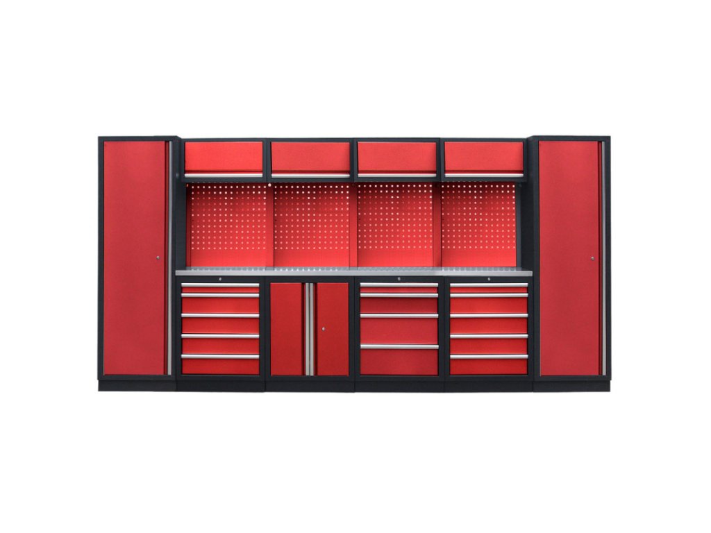 Dílenský nábytek PROFI RED s nerezovou deskou zaujme moderním a profesionálním vzhledem. Kombinace červené RAL 3031 a černé RAL 9004 barvy se bude vyjímat v každé garáži i dílně. Sestava nábytku v sobě skrývá dostatečné množství úložného prostoru pro vaše nářadí, autotechniku i dílenské vybavení. V kombinaci s bytelnou pracovní deskou získáte multifunkční stěnu, se kterou vám půjde práce od ruky ve všech směrech. Jednotlivé komponenty jsou plně konfigurovatelné, sestavu je možné dle vašich potřeb rozšířit o další skříně, regály i ponk.Sestava nábytku RTGS1300AV