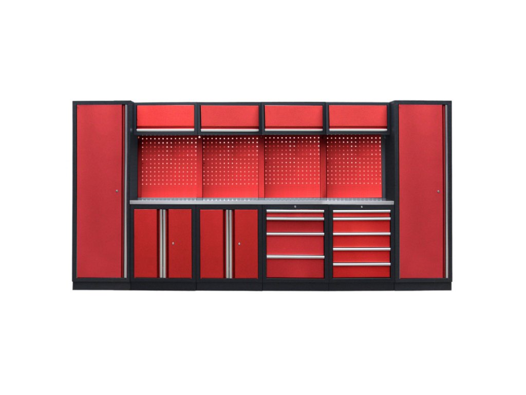 Dílenský nábytek PROFI RED s nerezovou deskou zaujme moderním a profesionálním vzhledem. Kombinace červené RAL 3031 a černé RAL 9004 barvy se bude vyjímat v každé garáži i dílně. Sestava nábytku v sobě skrývá dostatečné množství úložného prostoru pro vaše nářadí, autotechniku i dílenské vybavení. V kombinaci s bytelnou pracovní deskou získáte multifunkční stěnu, se kterou vám půjde práce od ruky ve všech směrech. Jednotlivé komponenty jsou plně konfigurovatelné, sestavu je možné dle vašich potřeb rozšířit o další skříně, regály i ponk.Sestava nábytku RTGS1300BB8