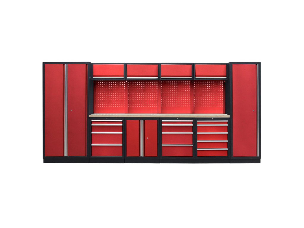 Dílenský nábytek PROFI RED s dřevěnou deskou zaujme moderním a profesionálním vzhledem. Kombinace červené RAL 3031 a černé RAL 9004 se bude vyjímat v každé garáži i dílně. Sestava nábytku v sobě skrývá dostatečné množství úložného prostoru pro vaše nářadí, autotechniku i dílenské vybavení. V kombinaci s bytelnou pracovní deskou získáte multifunkční stěnu, se kterou vám půjde práce od ruky ve všech směrech. Jednotlivé komponenty jsou plně konfigurovatelné, sestavu je možné dle vašich potřeb rozšířit o další skříně, regály i ponk.Sestava nábytku RTGS1300A5