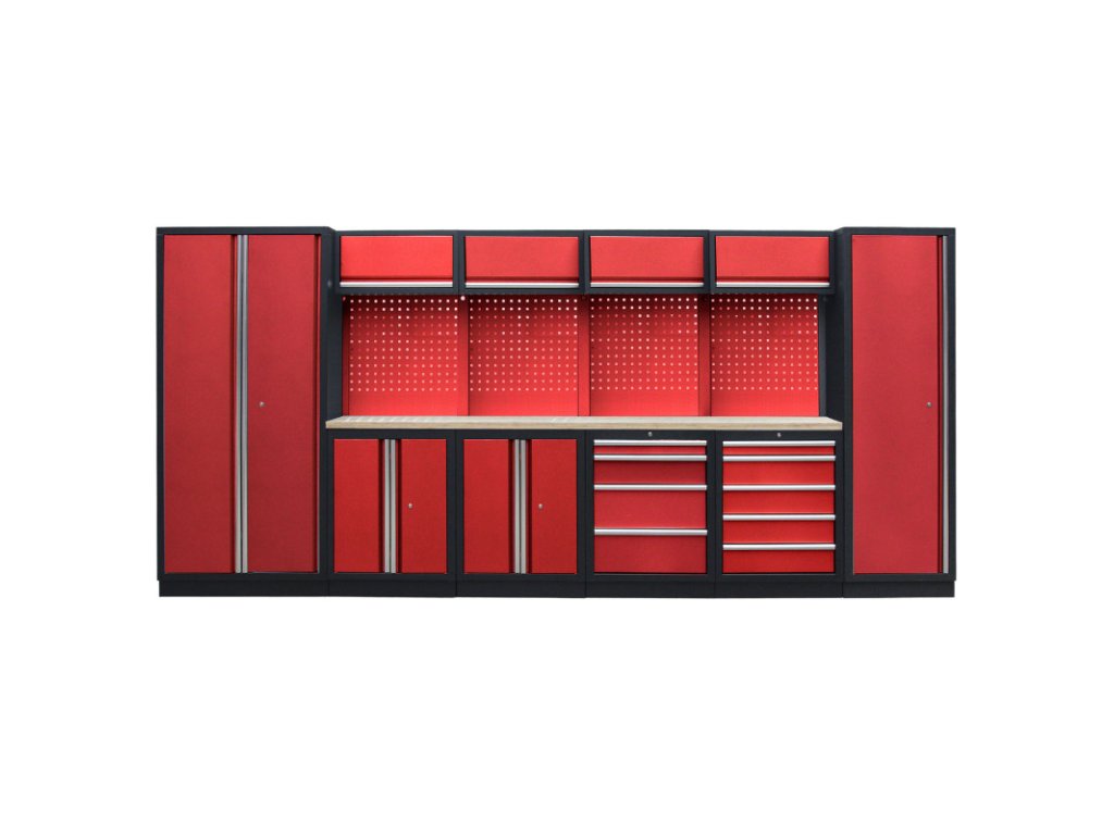 Dílenský nábytek PROFI RED s dřevěnou deskou zaujme moderním a profesionálním vzhledem. Kombinace červené RAL 3031 a černé RAL 9004 se bude vyjímat v každé garáži i dílně. Sestava nábytku v sobě skrývá dostatečné množství úložného prostoru pro vaše nářadí, autotechniku i dílenské vybavení. V kombinaci s bytelnou pracovní deskou získáte multifunkční stěnu, se kterou vám půjde práce od ruky ve všech směrech. Jednotlivé komponenty jsou plně konfigurovatelné, sestavu je možné dle vašich potřeb rozšířit o další skříně, regály i ponk.Sestava nábytku RTGS1300AA6