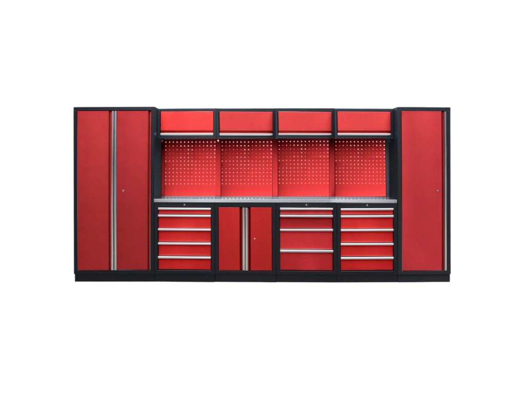 Dílenský nábytek PROFI RED s nerezovou deskou zaujme moderním a profesionálním vzhledem. Kombinace červené RAL 3031 a černé RAL 9004 barvy se bude vyjímat v každé garáži i dílně. Sestava nábytku v sobě skrývá dostatečné množství úložného prostoru pro vaše nářadí, autotechniku i dílenské vybavení. V kombinaci s bytelnou pracovní deskou získáte multifunkční stěnu, se kterou vám půjde práce od ruky ve všech směrech. Jednotlivé komponenty jsou plně konfigurovatelné, sestavu je možné dle vašich potřeb rozšířit o další skříně, regály i ponk.Sestava nábytku RTGS1300AL