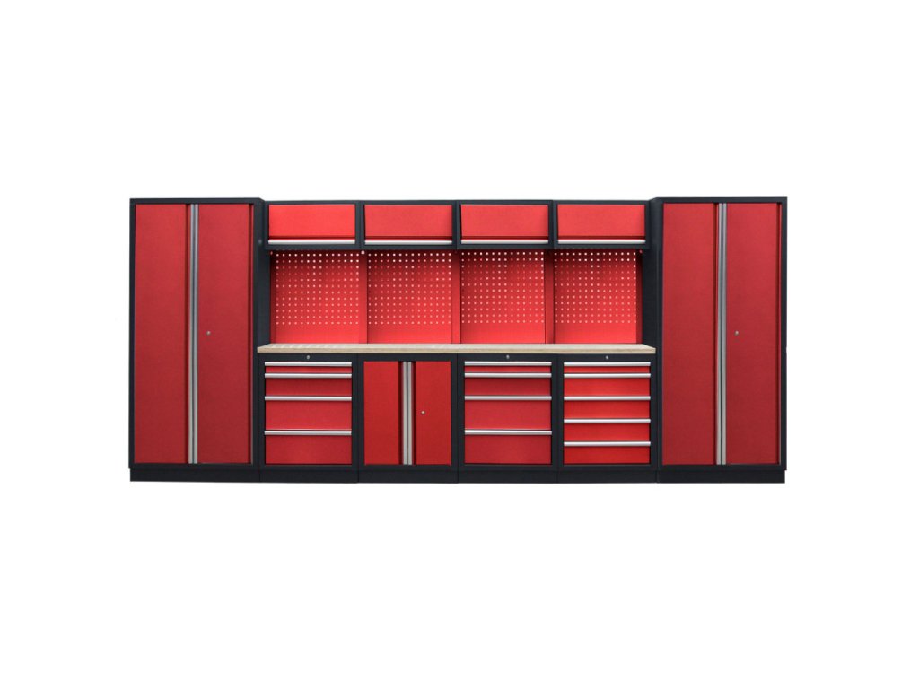 Dílenský nábytek PROFI RED s dřevěnou deskou zaujme moderním a profesionálním vzhledem. Kombinace červené RAL 3031 a černé RAL 9004 se bude vyjímat v každé garáži i dílně. Sestava nábytku v sobě skrývá dostatečné množství úložného prostoru pro vaše nářadí, autotechniku i dílenské vybavení. V kombinaci s bytelnou pracovní deskou získáte multifunkční stěnu, se kterou vám půjde práce od ruky ve všech směrech. Jednotlivé komponenty jsou plně konfigurovatelné, sestavu je možné dle vašich potřeb rozšířit o další skříně, regály i ponk.Sestava nábytku RTGS1300A2
