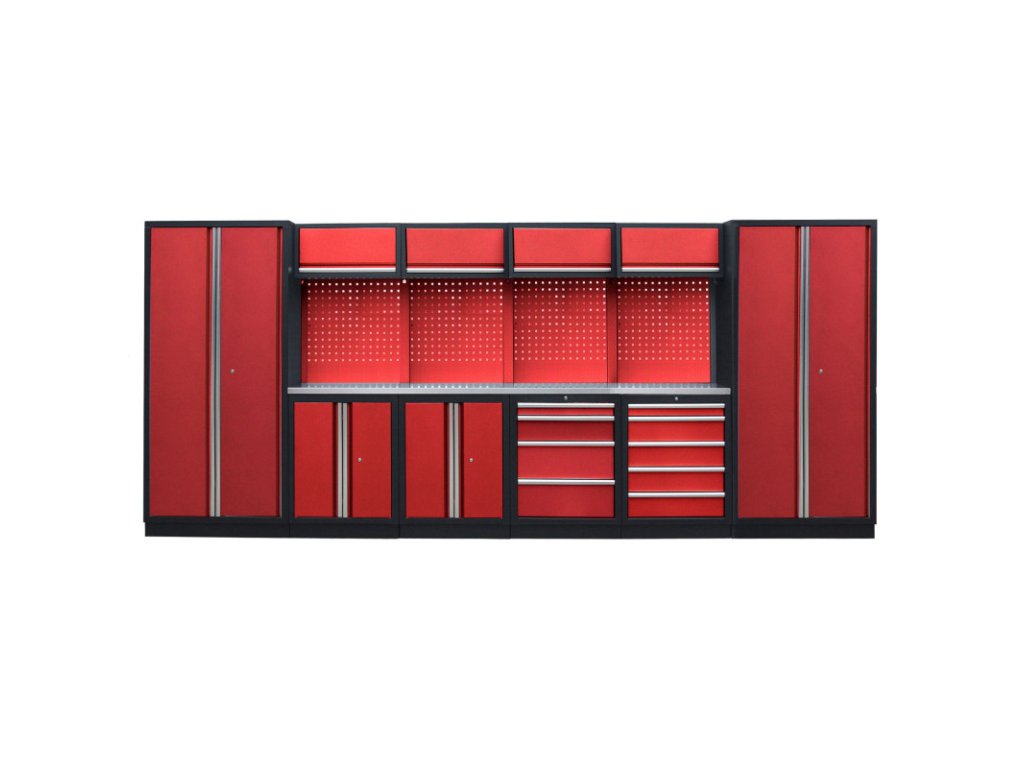 Dílenský nábytek PROFI RED s nerezovou deskou zaujme moderním a profesionálním vzhledem. Kombinace červené RAL 3031 a černé RAL 9004 barvy se bude vyjímat v každé garáži i dílně. Sestava nábytku v sobě skrývá dostatečné množství úložného prostoru pro vaše nářadí, autotechniku i dílenské vybavení. V kombinaci s bytelnou pracovní deskou získáte multifunkční stěnu, se kterou vám půjde práce od ruky ve všech směrech. Jednotlivé komponenty jsou plně konfigurovatelné, sestavu je možné dle vašich potřeb rozšířit o další skříně, regály i ponk.Sestava nábytku RTGS1300BB2