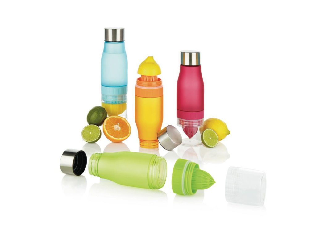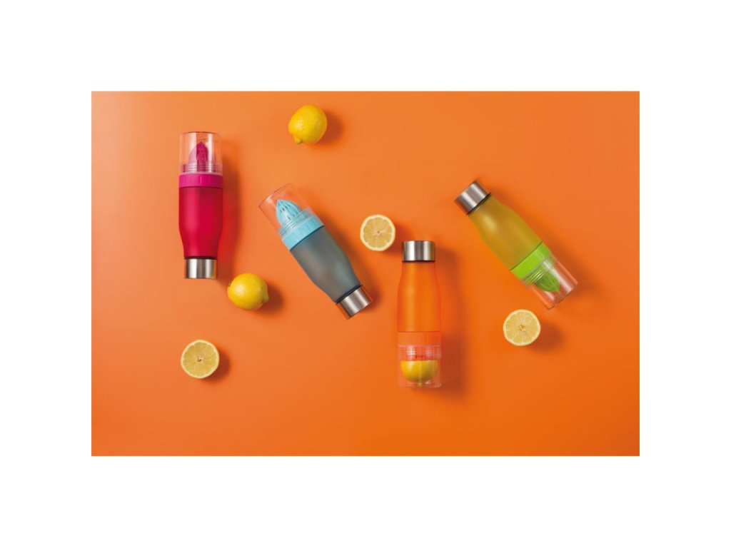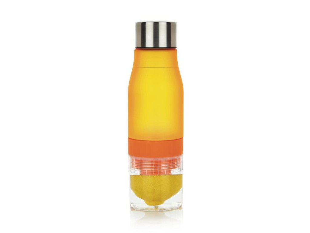Ve spodku lahve se skrývá odšťavňovací hlava pro našroubování citronu a poté jen stačí nalít vodu.
