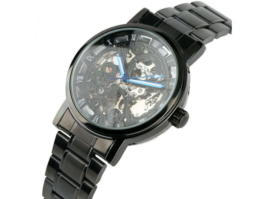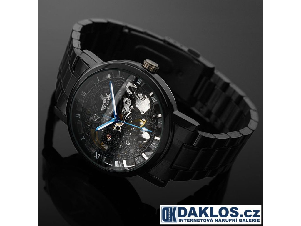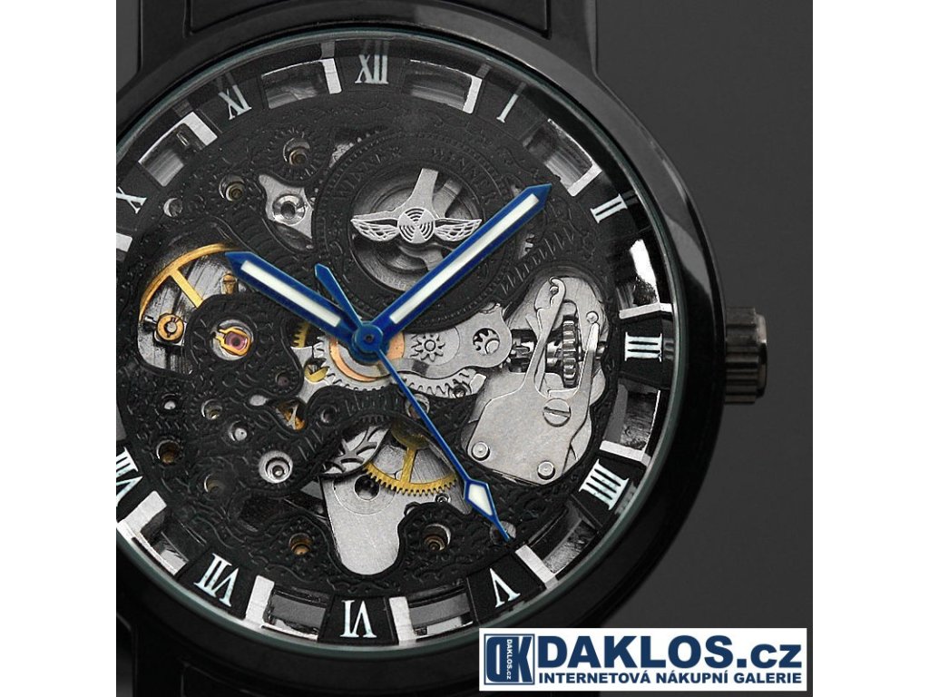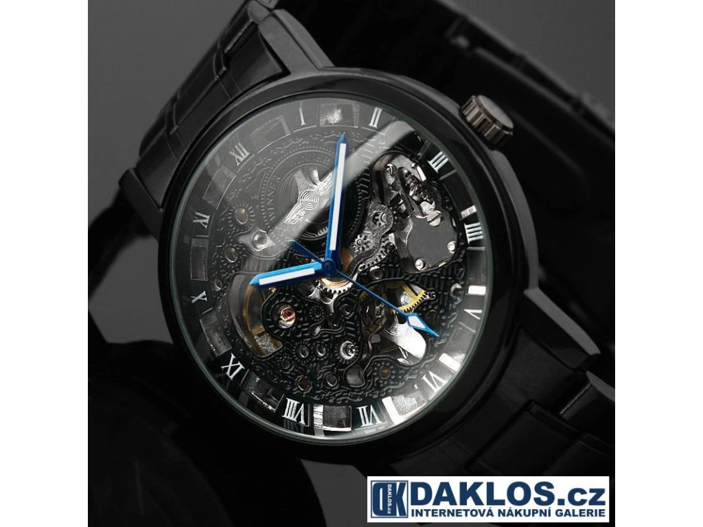 Luxusní černé hodinky WINNER s modrými ručičkami a průhledným ciferníkem - automatické