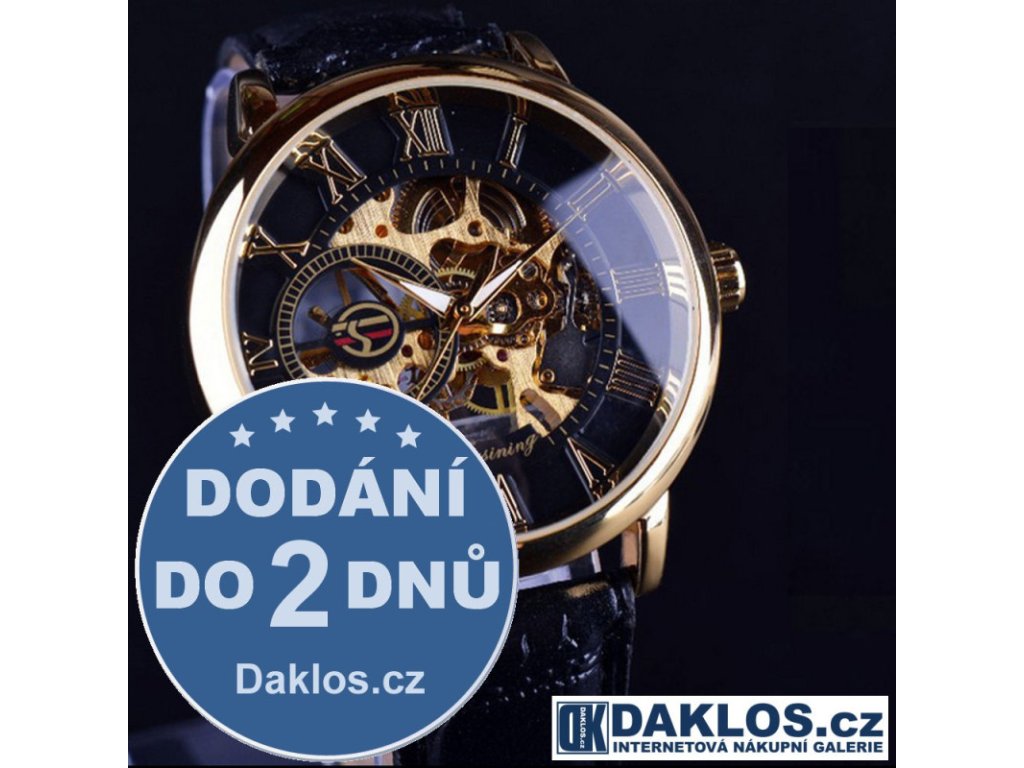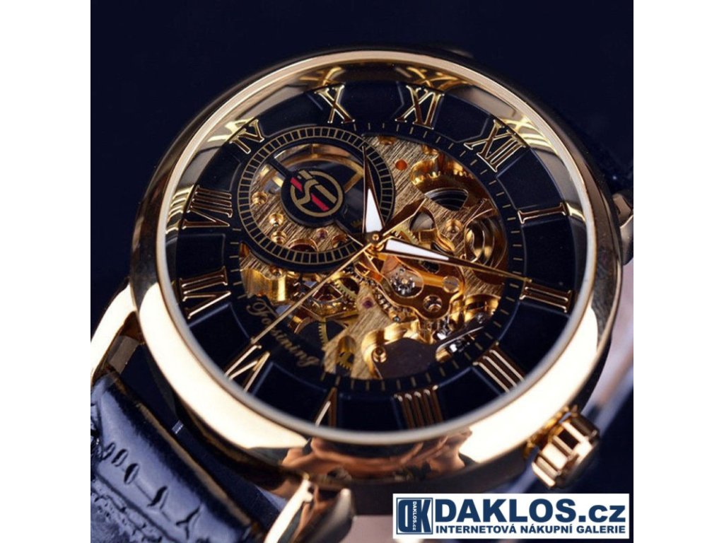Luxusní hodinky s průhledným ciferníkem s římskými číslicemi a černozlatým pozadím - automatické