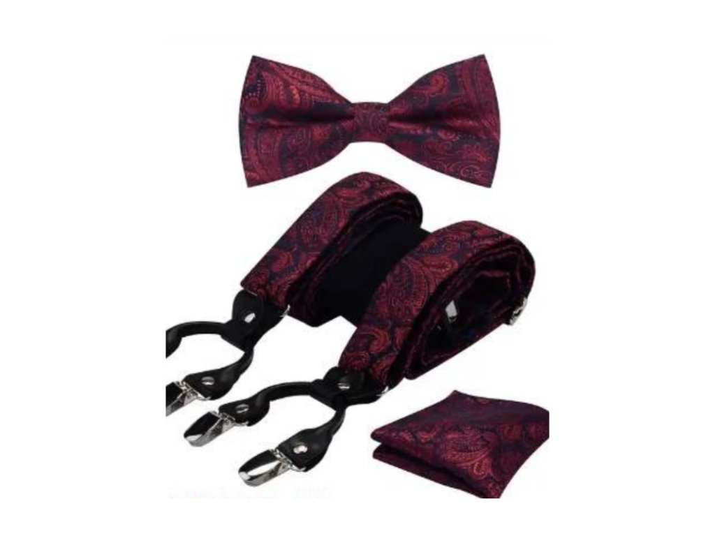 Luxusní set bordový se vzorem - Motýlek, kšandy (šle) a kapesníček v dárkovém balení