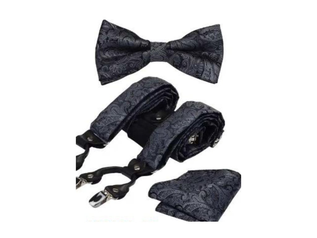 Luxusní set černo šedý se vzorem - Motýlek, kšandy (šle) a kapesníček v dárkovém balení