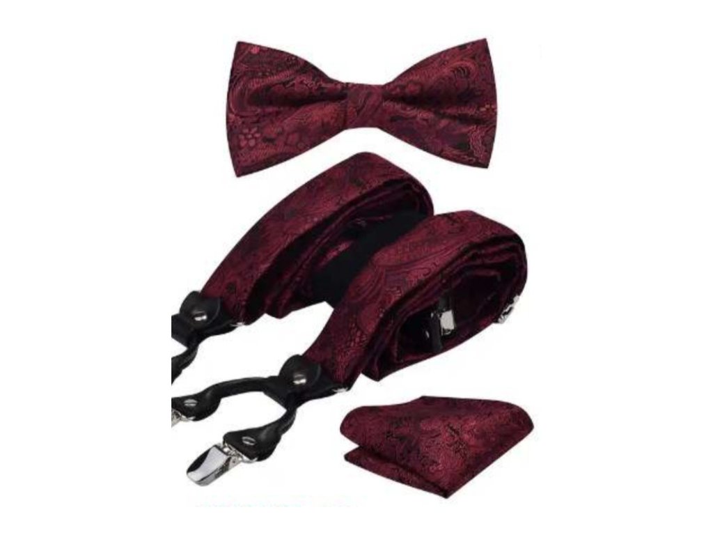 Luxusní set červený s květinovým vzorem - Motýlek, kšandy (šle) a kapesníček v dárkovém balení