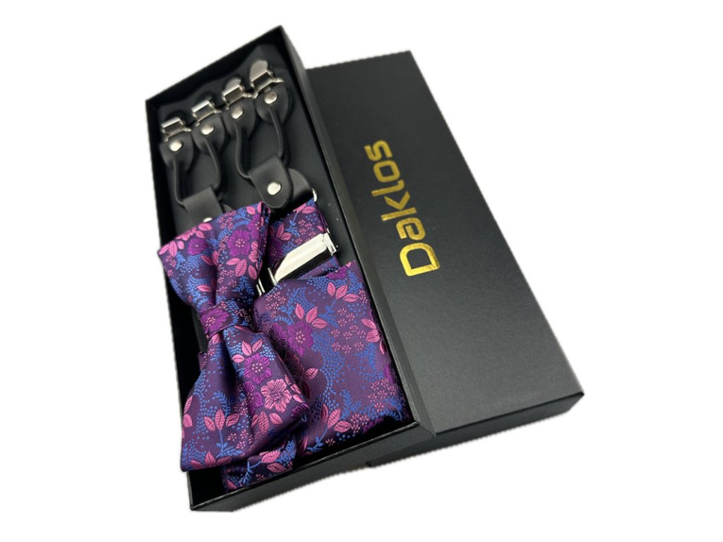 Luxusní set fialový a lehce modrý květovaný vzor - Motýlek, kšandy (šle) a kapesníček v dárkovém balení